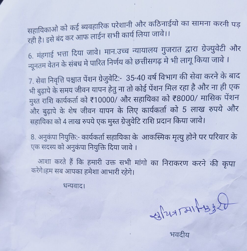 सेवा निवृत्ति के बाद पेंशन 10,000/- (कार्यकर्ता) एवं 8,000/- (सहायिका) तथा क्रमशः 5 लाख और 4 लाख की ग्रेज्युटी दी जाए।