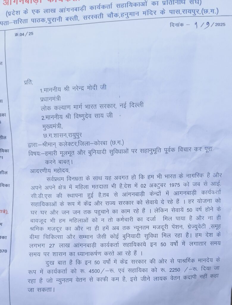 कोरबा। आंगनबाड़ी केन्द्रों में सेवाएं दे रही कार्यकर्ता-सहायिकाएँ अब अपने अधिकारों को लेकर मुखर हो गई हैं। इन्होंने कहा कि आईसीडीएस योजना को लागू हुए 50 वर्ष पूरे होने के बाद भी उन्हें न तो कर्मचारी का दर्जा मिला और न ही न्यूनतम मजदूरी, पेंशन, ग्रेज्युटी, बीमा और चिकित्सा जैसी बुनियादी सुविधाएँ।