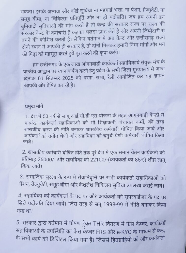 छत्तीसगढ़ की करीब एक लाख आंगनबाड़ी कार्यकर्ता-सहायिकाओं ने प्रांतीय आह्वान पर 1 सितम्बर को प्रदेश के सभी जिला मुख्यालयों में धरना, सभा और रैली आयोजित कर सरकार का ध्यान आकर्षित किया। आंगनवाड़ी कार्यकर्ता सहायिका संयुक्त मंच छत्तीसगढ़ के बैनर तले कोरबा के आईटीआई तानसेन चौक पर धरना उपरांत रैली की शक्ल में कलेक्ट्रेट पहुंचकर जिला कलेक्टर के माध्यम से प्रधानमंत्री व छत्तीसगढ़ के मुख्यमंत्री के नाम ज्ञापन सौंपकर अपनी मांगें रखीं।