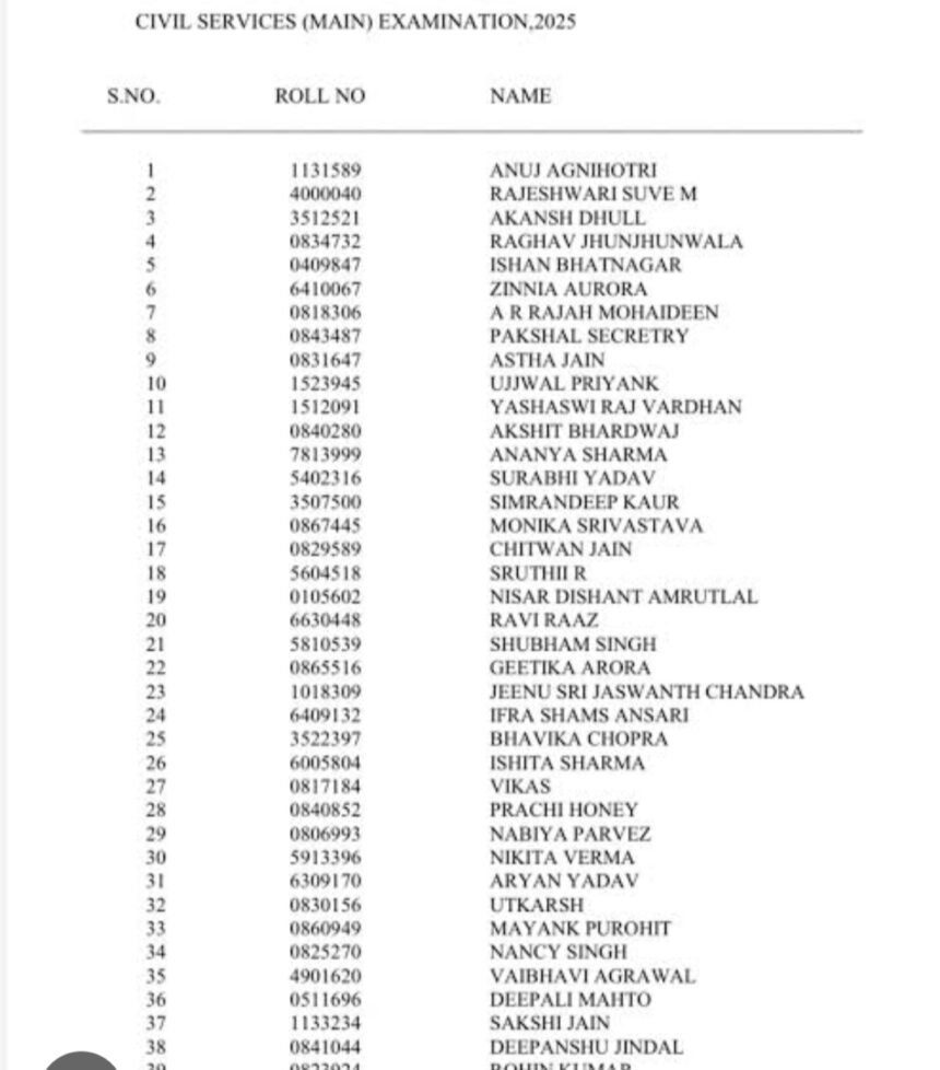 नई दिल्ली/रायपुर। Union Public Service Commission (UPSC) ने सिविल सेवा परीक्षा 2025 का फाइनल रिजल्ट जारी कर दिया है। परीक्षा में शामिल हुए उम्मीदवार आयोग की आधिकारिक वेबसाइट upsc.gov.in पर जाकर अपना परिणाम देख और डाउनलोड कर सकते हैं। परिणाम पीडीएफ फॉर्मेट में जारी किया गया है, जिसमें चयनित अभ्यर्थियों के नाम और रोल नंबर दर्ज हैं।