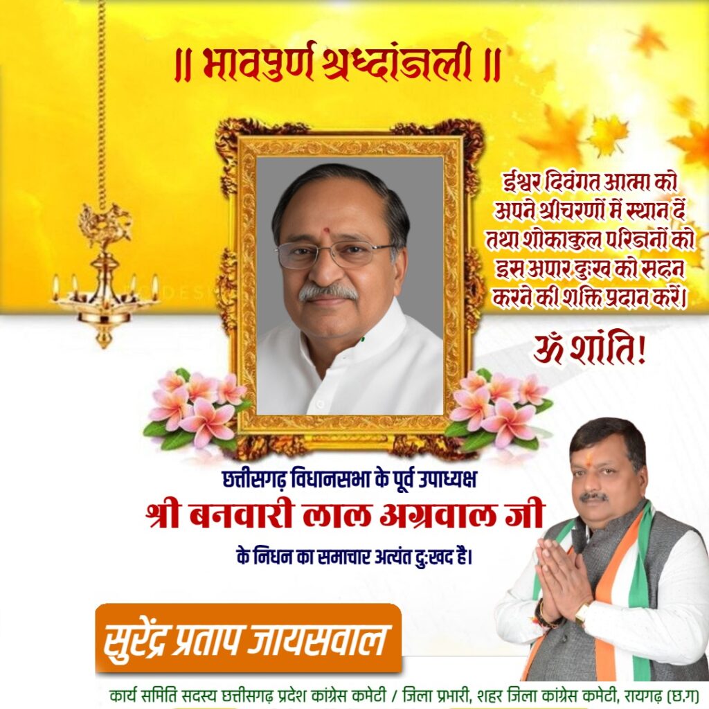 स्मृति शेष बनवारी लाल अग्रवाल राष्ट्रीय स्वयंसेवक संघ (RSS) की विचारधारा के प्रति प्रतिबद्ध और एक सिद्धांतवादी भाजपा नेता थे।छत्तीसगढ़ राज्य गठित होने के बाद वे राज्य के पहले विधानसभा उपाध्यक्ष बने थे। उनका जाना प्रदेश व भाजपा की राजनीति के एक युग का अवसान की भांति है।