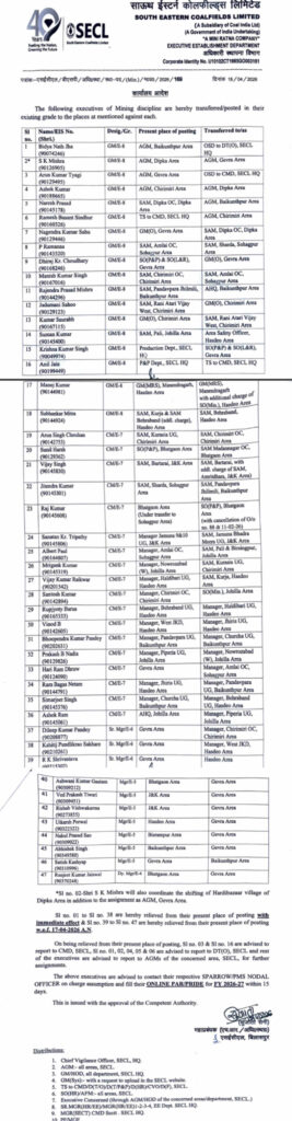 कोरबा। साउथ ईस्टर्न कोलफील्ड्स लिमिटेड (SECL) ने 47 अधिकारियों का तबादला आदेश जारी किया है। बुधवार, 15 अप्रेल को जारी आदेश के अनुसार 47 एग्जीक्यूटिव में 18 महाप्रबंधक हैं। इनमें एजीएम गेवरा एरिया अरूण कुमार त्यागी को सीएमडी का ओएसडी बनाया गया है।