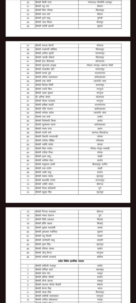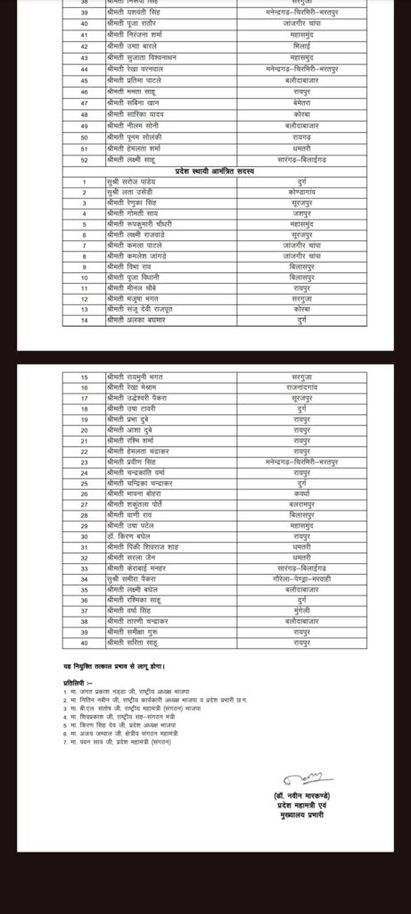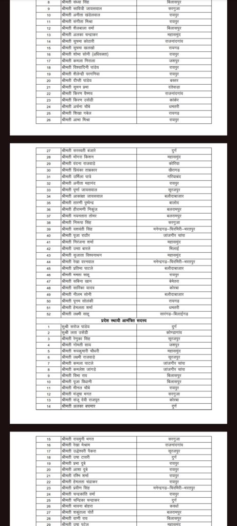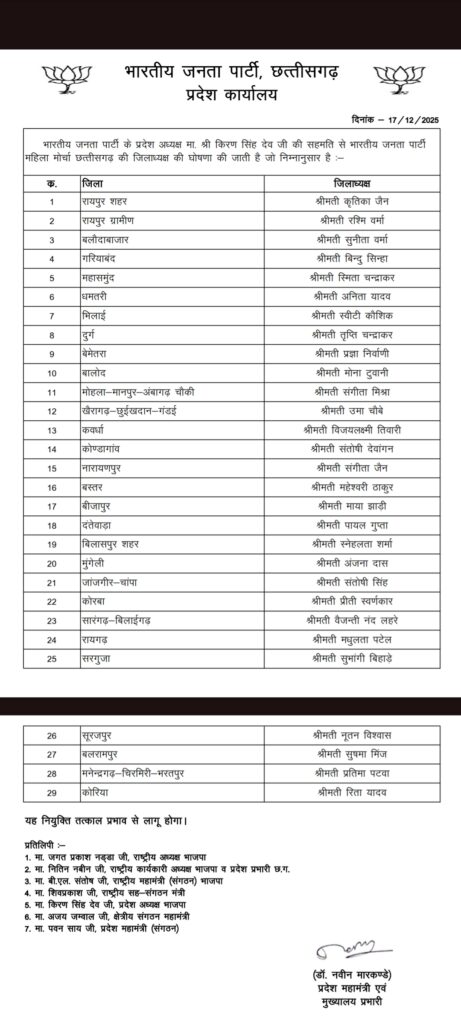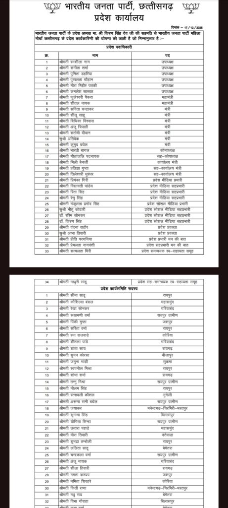Reading: BJP BREAK: महिला मोर्चा की कार्यकारिणी घोषित, प्रीति कोरबा जिला अध्यक्ष, देखिए किसे मिला कौन सा पद