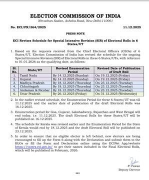 मध्य प्रदेश, छत्तीसगढ़ एवं अंडमान और निकोबार के लिए अंतिम तिथि 18 दिसंबर 2025 (गुरुवार) से बढ़ाकर 23 दिसंबर 2025 (मंगलवार) कर दी गई है. वहीं, यूपी में SIR की अंतिम तिथि 26 से बढ़कर 31 दिसंबर 2025 (बुधवार) कर दी गई है. चुनाव आयोग ने इन सभी राज्यों के नागरिकों से अपील की है कि वे बढ़ी हुई तारीख का लाभ उठाते हुए शीघ्र अपना काम पूरा कर लें.