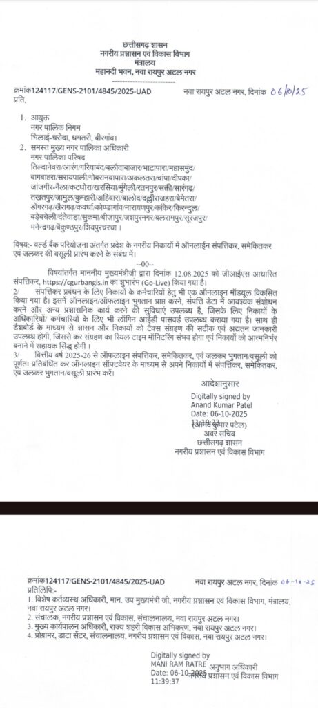 रायपुर/कोरबा। वर्ल्ड बैंक परियोजना अंतर्गत प्रदेश के नगरीय निकायों में ऑनलाईन संपत्तिकर, समेकितकर एवं जलकर की वसूली प्रारंभ करने के संबंध में निर्देश जारी किए गए हैं। यह आदेश दीपका और कटघोरा नगर पालिका परिषद के लिए भी लागू होगा।