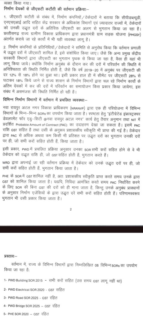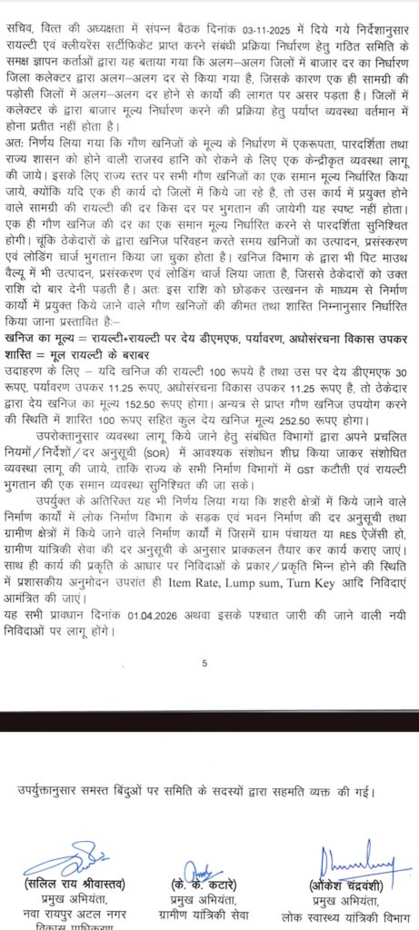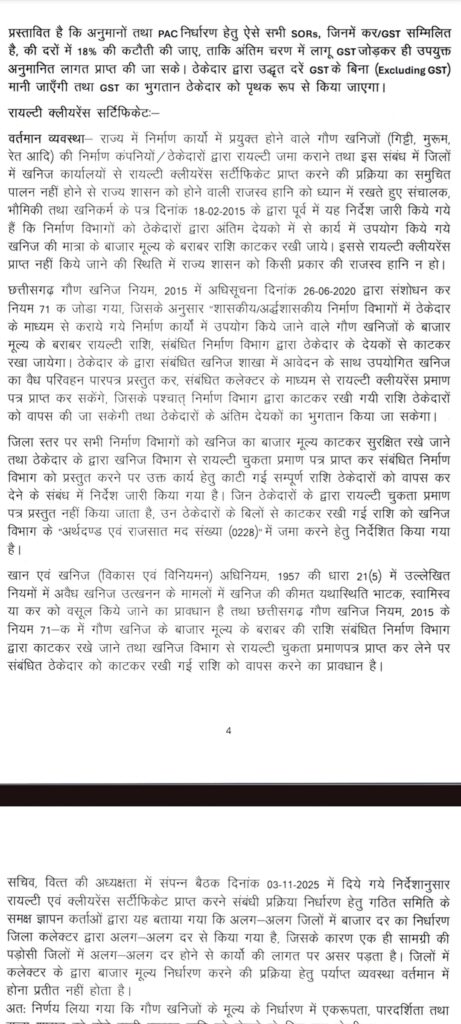 रायपुर। राज्य के सभी निर्माण विभागों में जीएसटी कटौती एवं रॉयल्टी क्लीयरेंस सर्टीफिकेट जारी करने की वर्तमान व्यवस्था में एकरूपता सुनिश्चित करने के लिए सरकार ने निर्णय लिया है। राज्य के मुख्य सचिव के निर्देश पर हुई बैठक उपरांत मुख्यमंत्री की अनुशंसा बाद निर्णय को लागू करने की कार्रवाई हेतु पत्र विभागों को जारी कर दिए गए हैं।