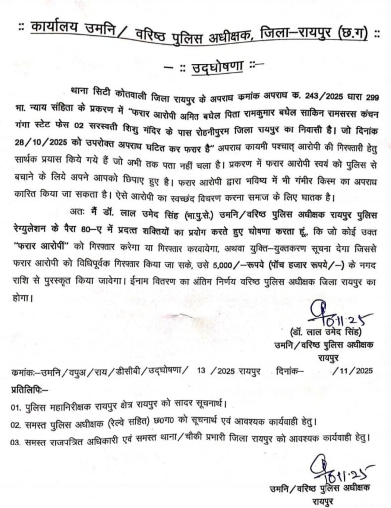 CG BREAK:फरार अमित बघेल पर ईनाम घोषित, तलाश जारी