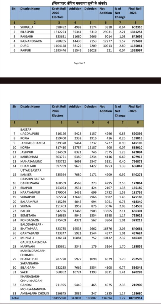 रायपुर। भारत निर्वाचन आयोग, नई दिल्ली के निर्देशानुसार छत्तीसगढ़ राज्य में निर्वाचक नामावलियों का विशेष गहन पुनरीक्षण (एसआईआर) अभियान शुरू किया गया है। राज्य भर में दिनांक 27 अक्टूबर 2025 से शुरू हुए और चार महीने तक लगातार चले एसआईआर (विशेष गहन पुनरीक्षण) अभियान के विभिन्न चरणों के प्रभावी संचालन के बाद आज दिनांक 21.02.2026 को निर्वाचक नामावली की अंतिम प्रकाशन किया गया। मतदाता सूची में अपना नाम शामिल कराने, मतदाता सूची से अपना नाम हटवाने या प्रविष्टियों में संशोधन से संबंधित दावे और आपत्तियां दिनांक 23.12.2025 से 22.01.2026 के बीच प्रस्तुत किए गए थे। प्राप्त दावे आपत्तियों का निराकरण दिनांक 14 फरवरी 2026 तक किया गया।