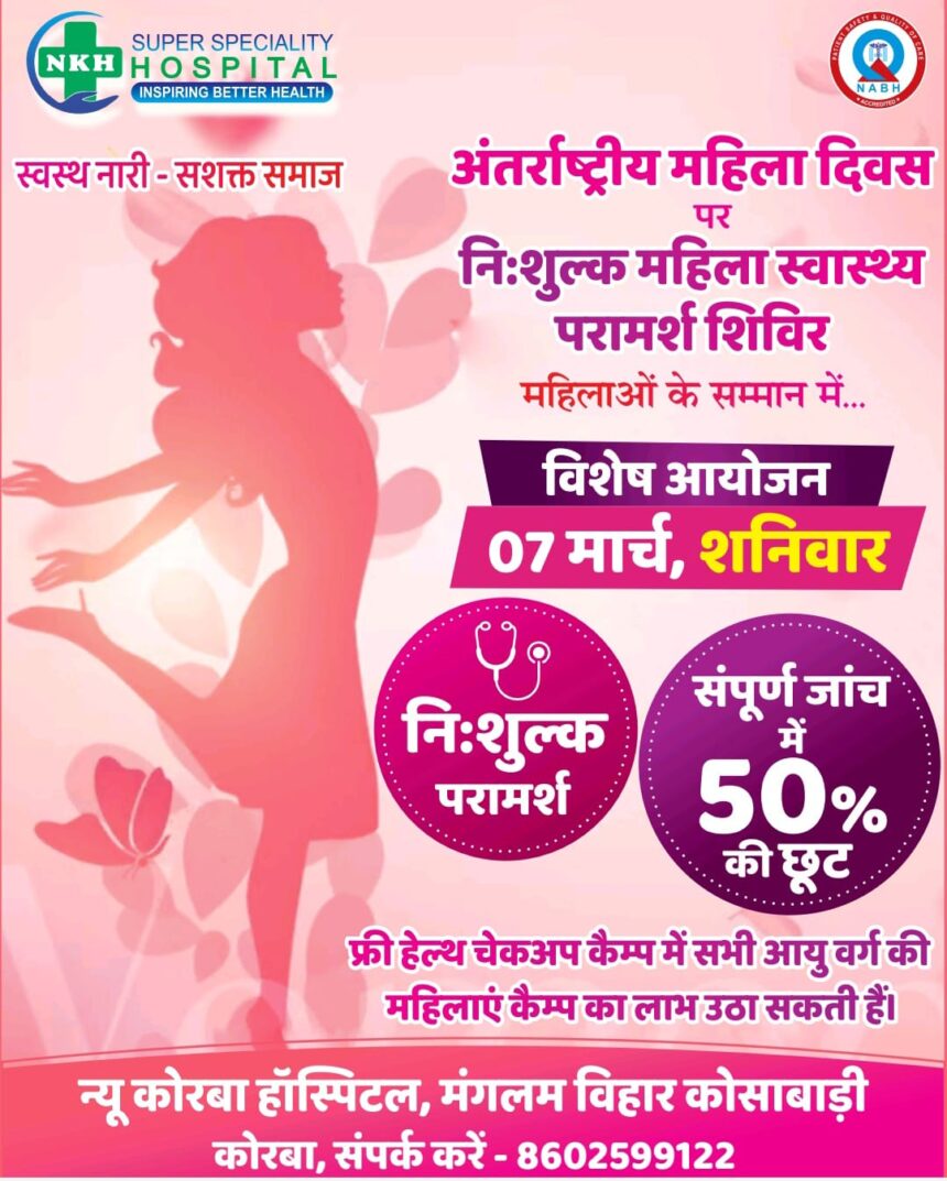 कोरबा। अंतर्राष्ट्रीय महिला दिवस के उपलक्ष्य में महिलाओं के स्वास्थ्य के प्रति जागरूकता बढ़ाने और उन्हें बेहतर चिकित्सा सुविधा उपलब्ध कराने के उद्देश्य से, कोसाबाड़ी स्थित न्यू कोरबा हॉस्पिटल (NKH) द्वारा एक विशेष पहल की जा रही है। ‘स्वस्थ नारी – सशक्त समाज’ के ध्येय वाक्य के साथ 07 मार्च, शनिवार को अस्पताल परिसर में एक वृहद निःशुल्क महिला स्वास्थ्य परामर्श शिविर का आयोजन किया जाएगा।