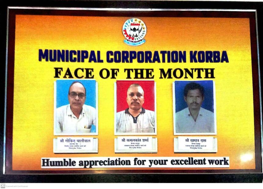 कोरबा। नगर पालिक निगम कोरबा के सहायक ग्रेड-।। गोविंद पालीवाल, हेल्पर मजदूर कमलकांत शर्मा एवं खम्हनदास को जुलाई माह का ’’ फेस आफ द मंथ ’’ चुना गया है। महापौर श्रीमती संजूदेवी राजपूत व आयुक्त आशुतोष पाण्डेय ने ’’ फेस आफ द मंथ ’’ चुने गए इन कर्मचारियों को बधाई दी है तथा कार्य के प्रति उनकी निष्ठा की सराहना की है।