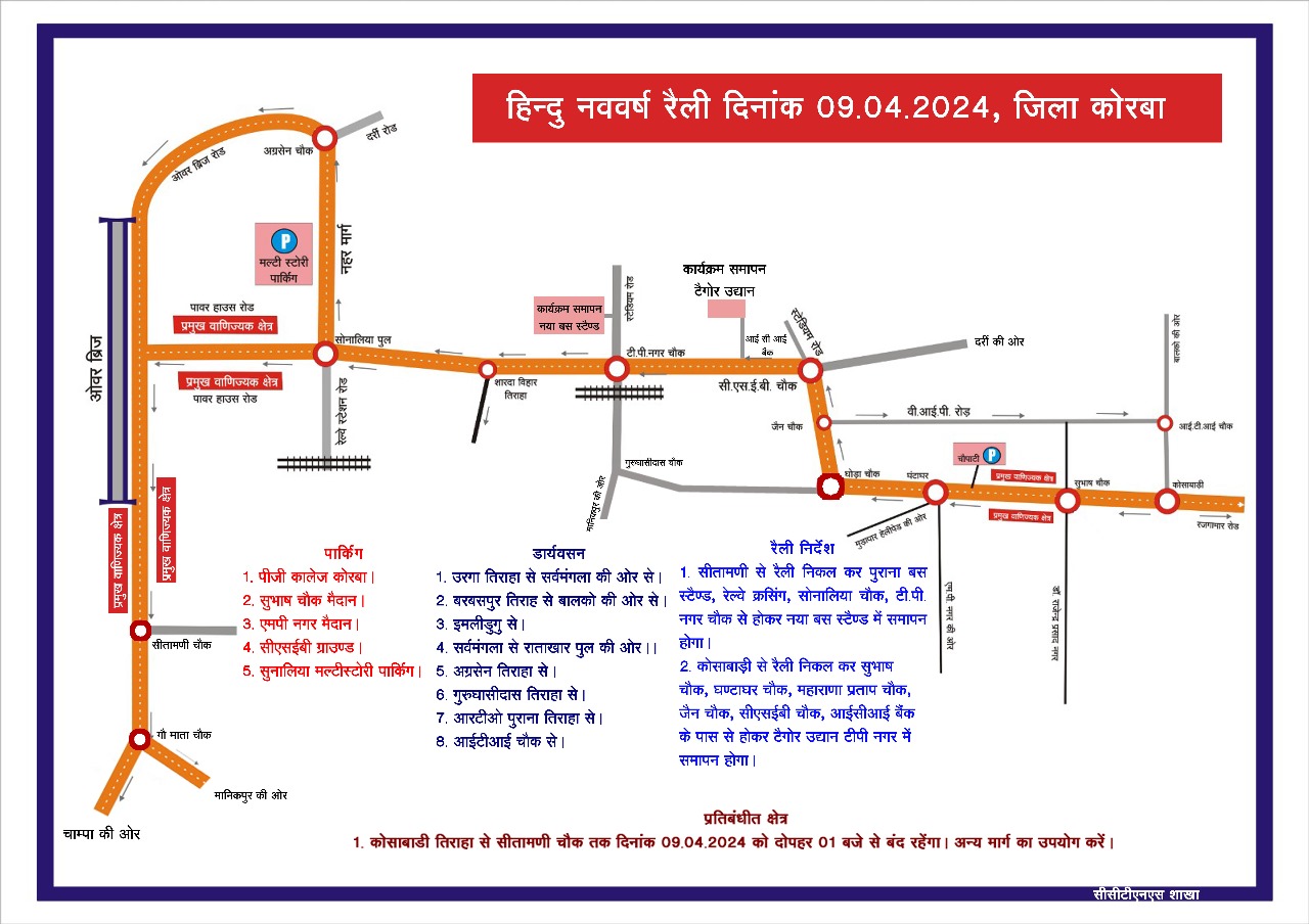 कोरबा। दिनांक 09.04.2024 को शहर में हिन्दू नव वर्ष के मौके पर दो अलग-अलग विशाल रैलियों का आयोजन किया गया है जिसमें बड़ी संख्या में दर्शकों एवं श्रद्धालुओं की उपस्थिति रहेगी। पहली शोभायात्रा कोसाबाड़ी स्थित हनुमान मंदिर से निकालकर टीपी नगर तथा दूसरी शोभायात्रा सीतामढ़ी से टीपी नगर के बीच गरिमापूर्ण ढंग से निकाला जाना है। दोनांे शोभायात्राओं को दृष्टिगत रखते हुए पुलिस एवं जिला प्रशासन द्वारा सुरक्षा व्यवस्था के व्यापक इंतजाम किए गये हैं। शोभायात्रा को हर्षोल्लास एवं शांतिपूर्ण ढंग से सम्पन्न कराने के उद्देष्य से पूरे शहर विशेषकर शोभायात्रा के मार्गो पर सीसीटीव्ही कैमरों एवं वीडियोग्राफी के माध्यम से रैली की आड़ में आसामाजिक तत्वों, जेब कतरों तथा शरीर से जेवर चोरी/ छीनने वालों की निगरानी रखी जाएगी। शोभायात्रा को देखते हुए पूर्व से स्थापित सीसीटीव्ही कैमरों के अतिरिक्त अन्य स्थानों पर जन सहयोग से नए सीसीटीव्ही कैमरे लगवाए गये हैं। बदमाशों पर निगाह रखने के लिए शोभायात्रा संचालन समितियों द्वारा अपने वालेंटियर्स के माध्यम से तथा पुलिस द्वारा ऐसे बदमाशों को पहचानने वाले स्पॉटर्स लगाकर असामाजिक तत्वों, चोरों, जेबकतरों एवं बदमाशों की पहचान एवं कार्यवाही की जावेगी।