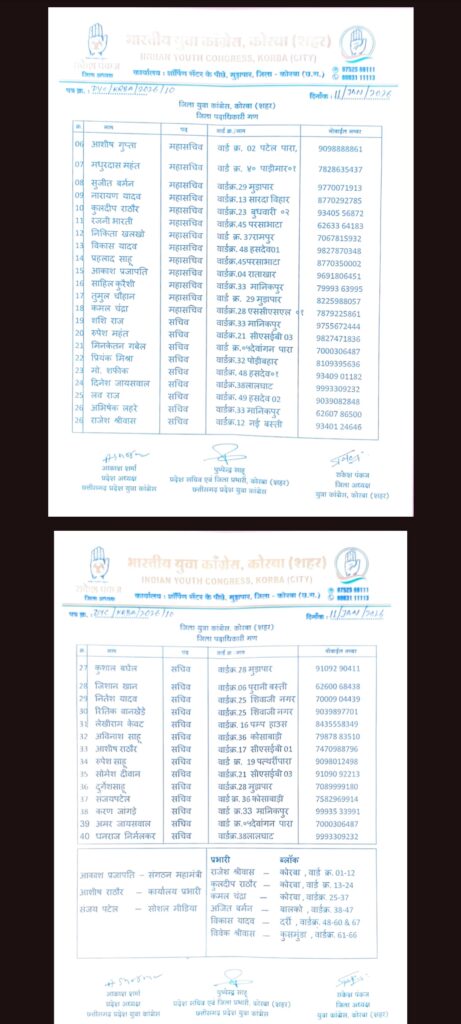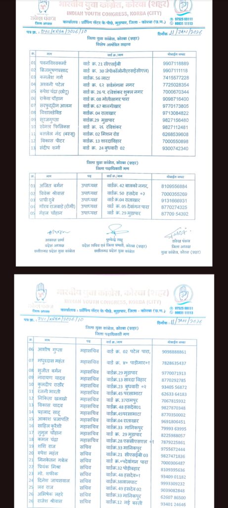 रायपुर/कोरबा। भारतीय युवा कांग्रेस राष्ट्रीय सचिव एवं प्रदेश प्रभारी अमित पठानिया, सह-प्रभारी डॉ. मोनिका मंडरे, प्रदेश अध्यक्ष आकाश शर्मा, प्रदेश सचिव एवं कोरबा शहर जिला युवा कांग्रेस प्रभारी पुष्पेंद्र साहू के अनुमोदन से जिला युवा कांग्रेस कोरबा (शहर) में उनकी मेहनत, सक्रियता एवं संगठन के प्रति प्रतिबद्धता के आधार पर जिम्मेदारी सौंपी गई है।