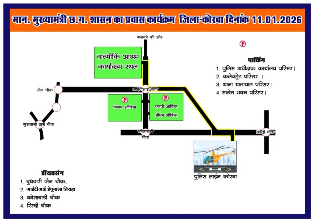 कोरबा। छत्तीसगढ़ के मुख्यमंत्री विष्णुदेव साय 11 जनवरी को कोरबा प्रवास पर रहेंगे। वे आईटीआई तानसेन चौक के निकट संचालित महर्षि वाल्मीकि आश्रम में आयोजित बैगा पुजेरी सम्मेलन में बतौर मुख्य अतिथि शामिल होंगे तथा गौरा गौरी पूजा में भी अपनी उपस्थिति दर्ज कराएंगे। मुख्यमंत्री के कोरबा प्रवास के मद्देनजर यातायात पुलिस ने रूट डायवर्ट किया है जिसका चार्ट जारी किया गया है।