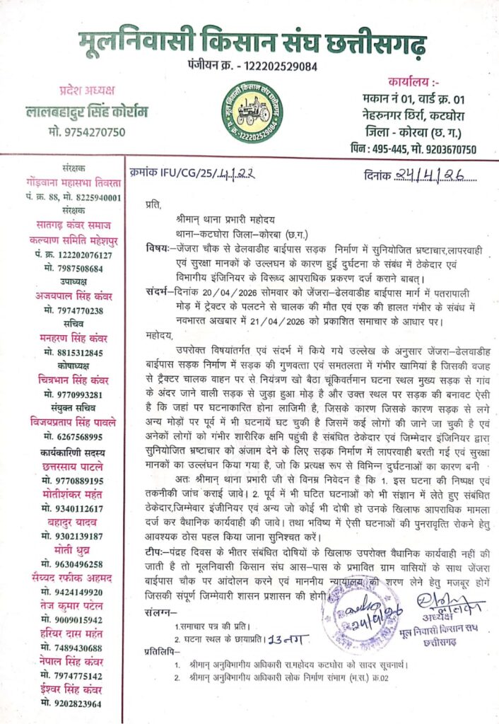 मूल निवासी किसान संघ छत्तीसगढ़ के प्रदेशाध्यक्ष लालबहादुर कोर्राम ने कटघोरा थाना प्रभारी को सौंपे ज्ञापन में कहा है कि घटना दिनाँक 20 अप्रैल सोमवार को जेंजरा-ढेलवाडीह बाईपास मार्ग पर पतरापाली मोड़ में ट्रेक्टर के पलटने से चालक की मौत एवं एक की हालत गंभीर है। जेंजरा-ढेलवाडीह बाईपास सड़क निर्माण में सड़क की गुणवत्ता एवं समतलता में गंभीर खामियां है। इसकी वजह से ट्रैक्टर चालक वाहन पर से नियंत्रण खो बैठा। चूंकि वर्तमान घटना स्थल पर मुख्य सड़क से गांव के अंदर जाने वाली सड़क से जुड़ा हुआ मोड़ है और उक्त स्थल पर सड़क की बनावट ऐसी है कि जहां पर घटना होना लाजिमी है, जिसके कारण सडक से लगे अन्य मोड़ों पर पूर्व में भी घटनायें घट चुकी है जिसमें कई लोगों की जाने जा चुकी है एवं अनेकों लोगों को गंभीर शारीरिक क्षति पहुंची है। संबंधित ठेकेदार एवं जिम्मेदार इंजिनियर द्वारा सुनियोजित भ्रष्टाचार को अंजाम देने के लिए सड़क निर्माण में लापरवाही बरती गई एवं सुरक्षा मानकों का उल्लंघन किया गया है, जो कि प्रत्यक्ष रूप से विभिन्न दुर्घटनाओं का कारण बनी