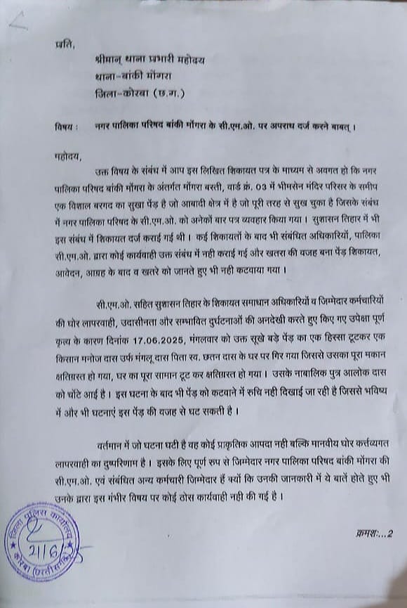 कोरबा-बांकीमोंगरा। नगर पालिका परिषद बांकी मोंगरा के सी.एम.ओ. पर अपराध दर्ज करने की मांग करते हुए वार्ड के लोगों में पुलिस से शिकायत की है। उन पर जानबूझकर उपेक्षा करने का आरोप लगाया गया है। मामले में लिखित आवेदन बांकीमोंगरा थाना में लेने से इंकार करने पर पीड़ितों ने पुलिस अधीक्षक कार्यालय में आवेदन दिया है। कहा गया है कि :-