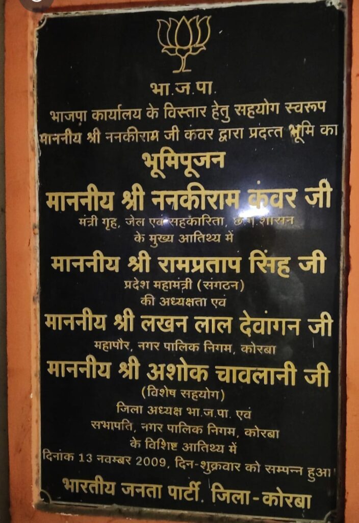 भाजपा के पुराने कार्यकर्ता बताते हैं कि संगठन में एक वह भी दौर था जब इसे आगे बढ़ाने के लिए हर कोई एकजुट होकर काम करता था। तब ना कोई गुटबाजी हुआ करती थी और ना मनभेद,मकसद सिर्फ भाजपा को स्थापित करना था। 90 के दशक में अविभाजित मध्यप्रदेश सरकार में ननकीराम कंवर ने कोरबा में जिला कार्यालय का प्रस्ताव रखा था जिसे तत्कालीन प्रदेश अध्यक्ष लखीराम अग्रवाल ने आगे बढ़ाया। प. दीनदयाल कुंज जिला कार्यालय का लोकार्पण 1993 में कुशाभाऊ ठाकरे द्वारा किया गया। कालांतर में वर्ष 2009 में जब ननकीराम कंवर गृहमंत्री, लखन लाल देवांगन महापौर, अशोक चावलानी जिला भाजपा अध्यक्ष और गोपाल मोदी श्री कंवर के शागिर्द हुआ करते थे,तब जिला कार्यालय आने वाले भाजपाईयों के लिए जगह छोटी व पार्किंग स्थल न होने से श्री कंवर ने बगल की खाली जमीन को खरीदा और जिला भाजपा को दान में दे दिया। 13 नवंबर 2009 का शिलालेख आज भी उनके योगदान की याद दिलाता है, आज ऐसे ननकीराम कंवर सहित जिले के अनेक भाजपा के कर्णधारों की गैर मौजूदगी,बिना आमंत्रण,बिना सम्मान के ही नए भवन की नींव रख दी गई। निःसंदेह ननकीराम कंवर सहित पूर्व कई जिलाध्यक्ष और उनके अपनों की भावनाएं आहत हुई हैं। कहीं न कहीं श्री कंवर की बार-बार सत्ता से लेकर संगठन तक की अनदेखी ने उन्हें जड़ से उखाड़ देने के उनके ही कभी खास रहे लोगों की मंशा को उजागर किया है।