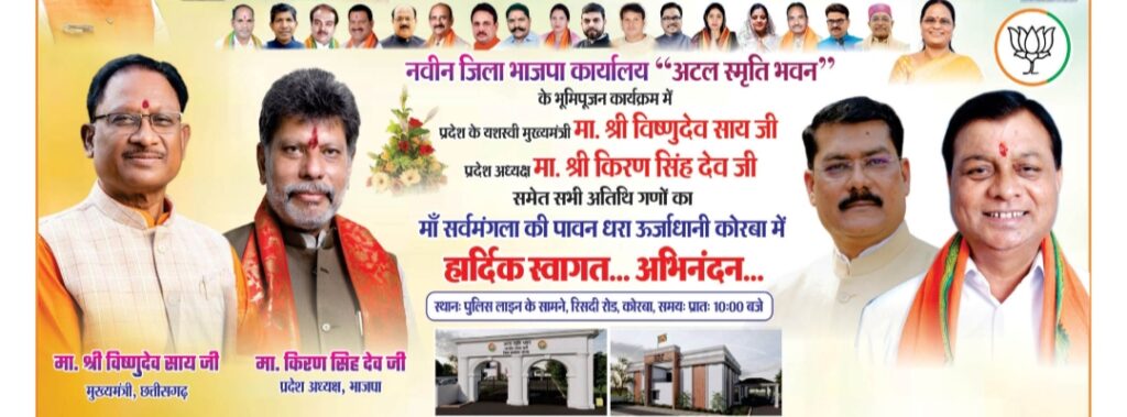 आयोजन के मंच से कहा गया कि कोरबा जिले के नवीन भाजपा जिला कार्यालय का नामकरण “अटल स्मृति भवन” के रूप में किया गया है, जो राष्ट्रनायक भारत रत्न अटल बिहारी वाजपेयी के विचारों और आदर्शों का प्रतीक होगा। यह कार्यालय दूर-दराज़ से आने वाले कार्यकर्ताओं के लिए संगठनात्मक गतिविधियों, प्रशिक्षण, वैचारिक विमर्श एवं जनसेवा का प्रमुख केंद्र बनेगा। नया प्रस्तावित कार्यालय केवल एक भवन नहीं, बल्कि भाजपा की विचारधारा, संस्कार और “राष्ट्र प्रथम” की भावना को और अधिक सुदृढ़ करने वाला वैचारिक केंद्र होगा।