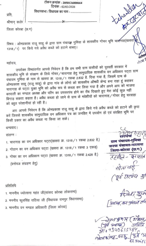 कलेक्टर जनदर्शन में करतला जनपद अंतर्गत ग्राम पंचायत गुमिया के सरपंच व अन्य द्वारा 2 मार्च को की गई शिकायत में कहा गया है कि हम सभी ग्रामवासियों को पूरवर्ती सरकार में शासकीय भूमि के संरक्षण के लिये गोचर / चारागाह हेतु सामुदायिक शासकीय वन अधिकार पट्टा ग्राम पंचायम गुमिंया के नाम से खसरा क्र. 1318/1 रकबा 2.832 हे. दिया गया है, जिसमें ग्राम के ओमप्रकाश साहू (राजू साहू) के द्वारा गांव के लोंगो को शासकीय औषधी केन्द्र बना रहा हूं,कहकर चारागाह के पट्टा युक्त भुमि को अवैध रूप से कब्जा कर लिया गया है और अपने आप को भाजपा बरपाली का मण्डल अध्यक्ष और पत्नि के उपसरपंच होने का रौब दिखाते हुए मेरा कोई कुछ नहीं बिगाड़ सकता कहता है। अवैध कब्जा हो जाने से ग्राम के मवेशियों को चारागाह/गोचर हेतु चरवाहा को बहुत परेशानियां हो रही है।