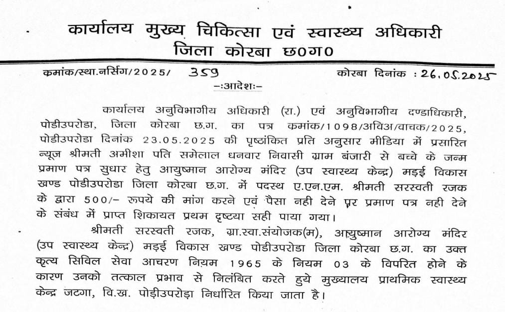 कोरबा-पोड़ी उपरोड़ा। बच्चे का जन्म प्रमाण पत्र देने और सुधार कराने के एवज में रुपये मांगने वाली ANM (ग्रामीण स्वास्थ्य कार्यकर्ता) को निलम्बित कर दिया गया है।