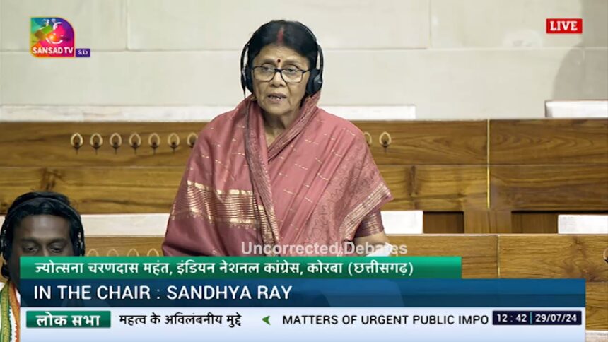 नई दिल्ली/कोरबा। कोरबा लोकसभा क्षेत्र की सांसद श्रीमती ज्योत्सना चरणदास महंत अपने संसदीय क्षेत्रवासियों की गंभीर समस्याओं, मांगों और मुद्दों को सदन में प्रमुखता से उठाती आ रही हैं। संसदीय क्षेत्रवासियों को बेहतर से बेहतर सुविधाएं दिलाने के लिए वह लगातार प्रयासरत हैं किंतु बार-बार मिल रहे आश्वासन के बावजूद भी कार्य धरातल पर नजर ना आने से वे चिंतित भी हैं। वे सदन में कोरबा संसदीय क्षेत्रवासियों की मुखर आवाज बनकर हर बार उभर रही हैं।