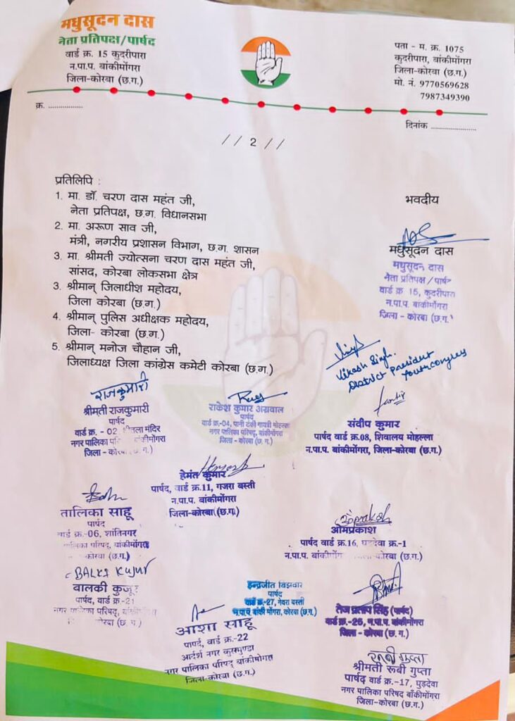 पार्षद तेजप्रताप सिंह ने कहा की – नगर पालिका में कुछ भी कार्य बोला जाता है तो नहीं किया जाता है हा लेकिन जहां सत्तापक्ष के फ़ायदे का कार्य रहेगा तो तुरंत हो जाता है कुलमिलाकर मनमानी व्यवस्था चल रही है। इस अवसर पर प्रमुखरूप से पार्षद तेजप्रताप सिंह,राकेश अग्रवाल,तालिका साहू,संदीप डहरिया,हेमंत शाहनी,ओमप्रकाश कैवर्त,रूबी पवन गुप्ता,बाल्की कुजूर,आशा साहू,इंद्रजीत बींझवार,राजकुमारी ,युवा कांग्रेस ज़िलाध्यक्ष विकास सिंह,आयुष यादव,शब्बीर ख़ान, और अनेक कांग्रेसी एवं आमजन उपस्थित थे।