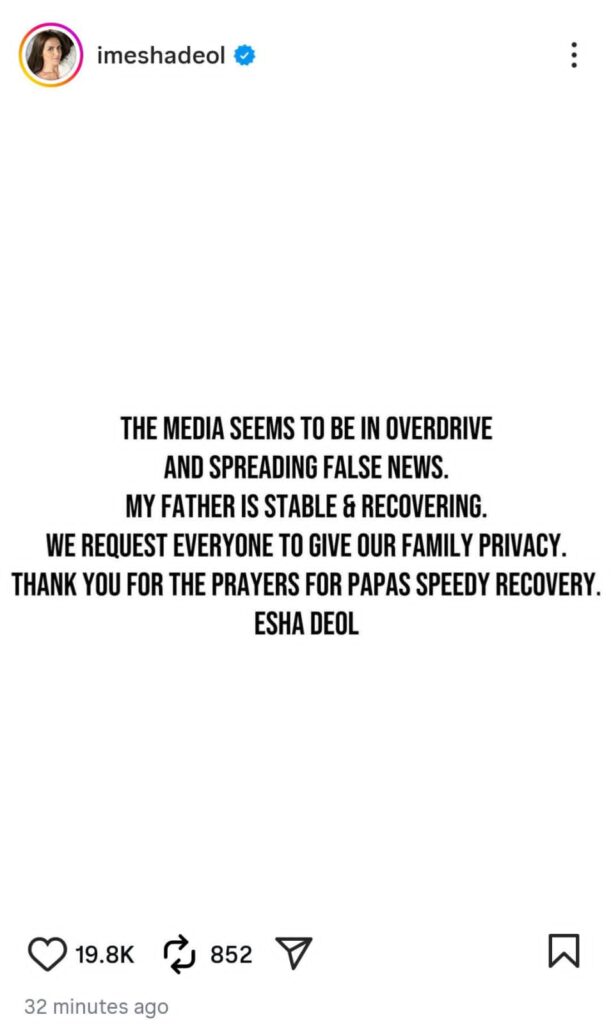 मुम्बई। मशहूर फिल्म अभिनेता धर्मेंद्र सिंह देओल के निधन की खबरों के बीच बड़ी जानकारी सामने आ रही है कि उनकी सांसें अभी चल रही हैं। उनमें जीवन की उम्मीद शेष है। पुत्री ईशा देओल ने सोशल मीडिया प्लेटफॉर्म पर अपनी यह बात तब साझा की है जब धर्मेंद्र के निधन की खबर देशभर में तेजी से फैल रही है। विभिन्न सोशल मीडिया प्लेटफॉर्म पर चल रही निधन की खबरों के बीच ईशा देओल ने उनकी सांस चलने की पुष्टि की है। प्रशंसक उनके स्वास्थ्य लाभ की कामना कर रहे हैं। ताजा अपडेट के अनुसार जब अभिनेता धर्मेन्द्र का स्वास्थ्य सुधार हो रहा है,तब सत्यसंवाद अपनी खबर के लिए खेद प्रकट करता है व उनके शीघ्र स्वास्थ्य लाभ की कामना भी करता है।