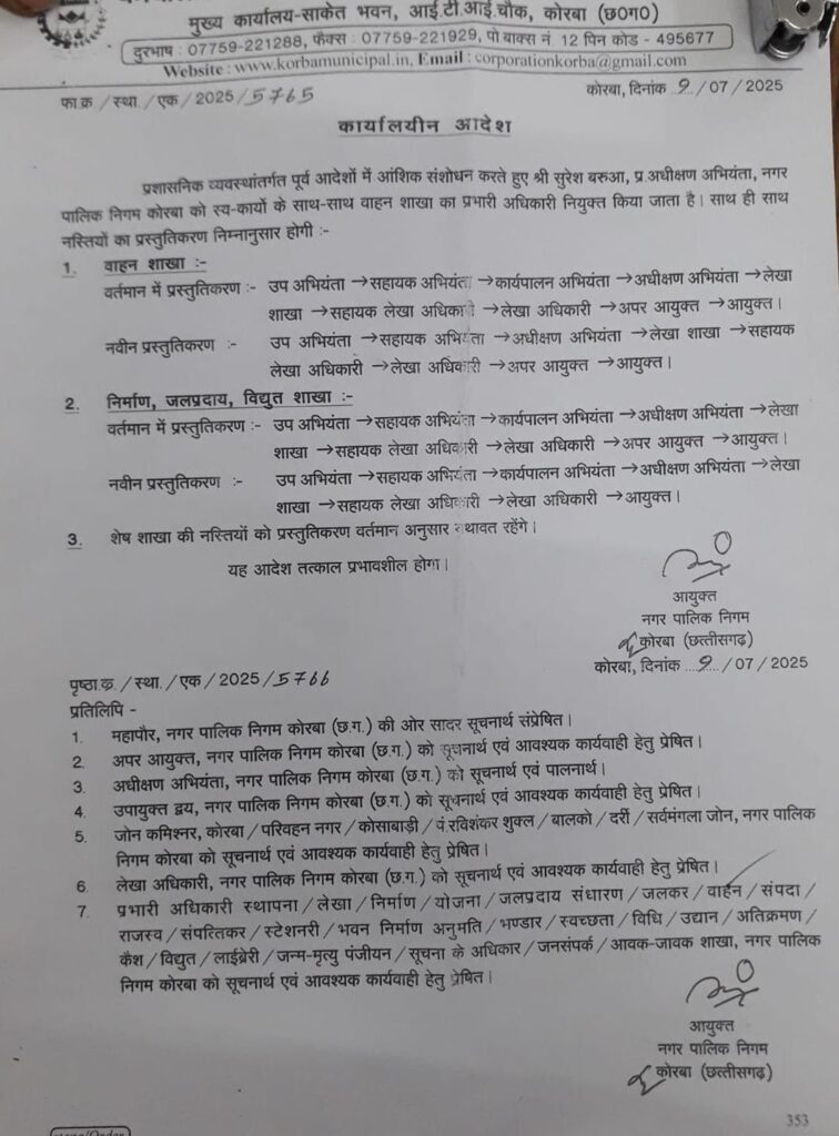 इसी तरह वाहन शाखा प्रभारी भूषण उरांव को हटा दिया गया है। अब निगम वाहन शाखा का प्रभार आयुक्त ने अधीक्षण अभियंता सुरेश बरुआ को सौंपा है। बता दें कि नगर निगम के वाहन शाखा प्रभारी पर कई गंभीर आरोप लगने के बाद उन्हें हटाने का आदेश जारी किया गया है। निगम कार्यालय से जारी आदेश के अनुसार अब वाहन शाखा का प्रभार निगम के अधीक्षण अभियंता सुरेश बरुआ अन्य जिम्मेदारी के साथ संभालेंगे।