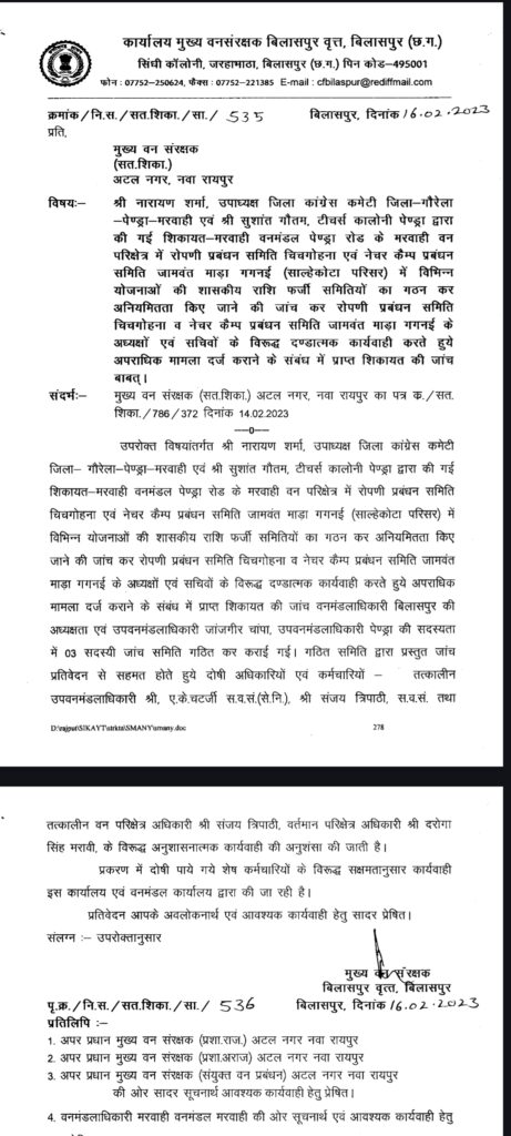 प्रमुख सचिव, छ.ग. शासन, वन एवं जलवायु परिवर्तन विभाग, मंत्रालय, महानदी भवन, नवा रायपुर, अटल नगर (छ.ग.) को प्रधान मुख्य वन संरक्षक एवं वन बल प्रमुख छ.ग. नवा रायपुर अटल नगर के द्वारा दिनांक 06/03/2023 को प्रेषित पत्र के अनुसार- विषयांतर्गत मुख्य वन संरक्षक, बिलासपुर वृत्त के संदर्भित पत्र द्वारा प्राप्त मरवाही वनमण्डल के अंतर्गत वन परिक्षेत्र मरवाही में रोपणी प्रबंधन समिति चिचगोहना एवं नेचर कैम्प प्रबंधन समिति जामवंत माड़ा गगनई (साल्हेकोटा परिसर) में किये गये कार्यों में अनियमितता की शिकायत पर जांच समिति के प्रतिवेदन के आधार पर संजय त्रिपाठी, स.व.सं. तत्कालीन उप वन मंडलाधिकारी पेण्ड्रा, मरवाही वन मंडल पेण्ड्रारोड़ के पदस्थिति अवधि के दौरान मरवाही वन परिक्षेत्र में रोपणी प्रबंधन समिति चिचगोहना एवं नेचर कैम्प प्रबंधन समिति जामवंत माड़ा गगनई (साल्हेकोटा परिसर) में विभिन्न योजनाओं की शासकीय राशि को फर्जी समिति का गठन कर अवैधानिक समिति के खाते में शासकीय राशि जमा करने के फलस्वरूप आहरण एवं व्यय कर शासकीय राशि का वित्तीय दुरूपयोग एवं वन वित्तीय नियमों/भण्डार क्रय नियम का पालन नहीं किया जाकर, शासन की राशि रू. 99,30,643/- का अनियमित एवं अनुचित व्यय किया गया है तथा नेचर कैम्प गगनई अंतर्गत प्रचलित निविदा के अलावा भिन्न निविदाकार से सामग्री क्रय में बाजार दर से ज्यादा मूल्य में सामग्री क्रय करने से शासन को राशि रू. 2,69,422/- की हानि हुई है, इस प्रकार कुल लगभग 1.02 करोड़ के अनियमित व्यय आंकलित किया गया है, जो वसूली योग्य है। अतः उपरोक्तानुसार अर्थिक अनियमितता हेतु संजय त्रिपाठी, स.व.सं. तत्कालीन उप वन मंडलाधिकारी पेण्ड्रा, मरवाही वन मंडल पेण्ड्रारोड को छत्तीसगढ़ सिविल सेवा (वर्गीकरण, नियंत्रण एवं अपील) नियम 1966 के उप नियम 9 (1) (क) में निहित प्रावधान अंतर्गत तत्काल प्रभाव से निलंबित कर, उनके विरूद्ध अनुशासनात्मक कार्यवाही प्रारंभ किया जाना प्रस्तावित है। कृपया तद्नुसार आवश्यक अग्रिम कार्यवाही किये जाने का अनुरोध है।